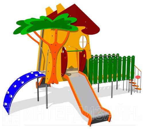 Детский игровой комплекс «Домик из Простоквашино» — в центре композиции расположена башня с двумя разнонаправленными горками. Вход на башню осуществляется по полукруглой скалолазной панели с искусственными камнями-зацепами, с одной стороны, и по горизонтальному мостику, с другой. Накладки на башне выполнены в форме домика.