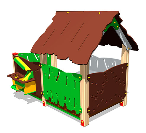Детский игровой домик «Хижина с кухней» представляет собой домик на стойках из клееного бруса и дополнительный модуль в виде маленькой кухни. На кухне дети могут устраивать игры с песком, развивая мелкую моторику рук.
