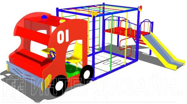 Макет-комплекс «Пожарная машина» состоит из трех самостоятельных модулей. Модули машинка «Пожарный», «Спортивные элементы» и «Горка» представляют собой цельносварные конструкции, облицованные фанерными накладками.