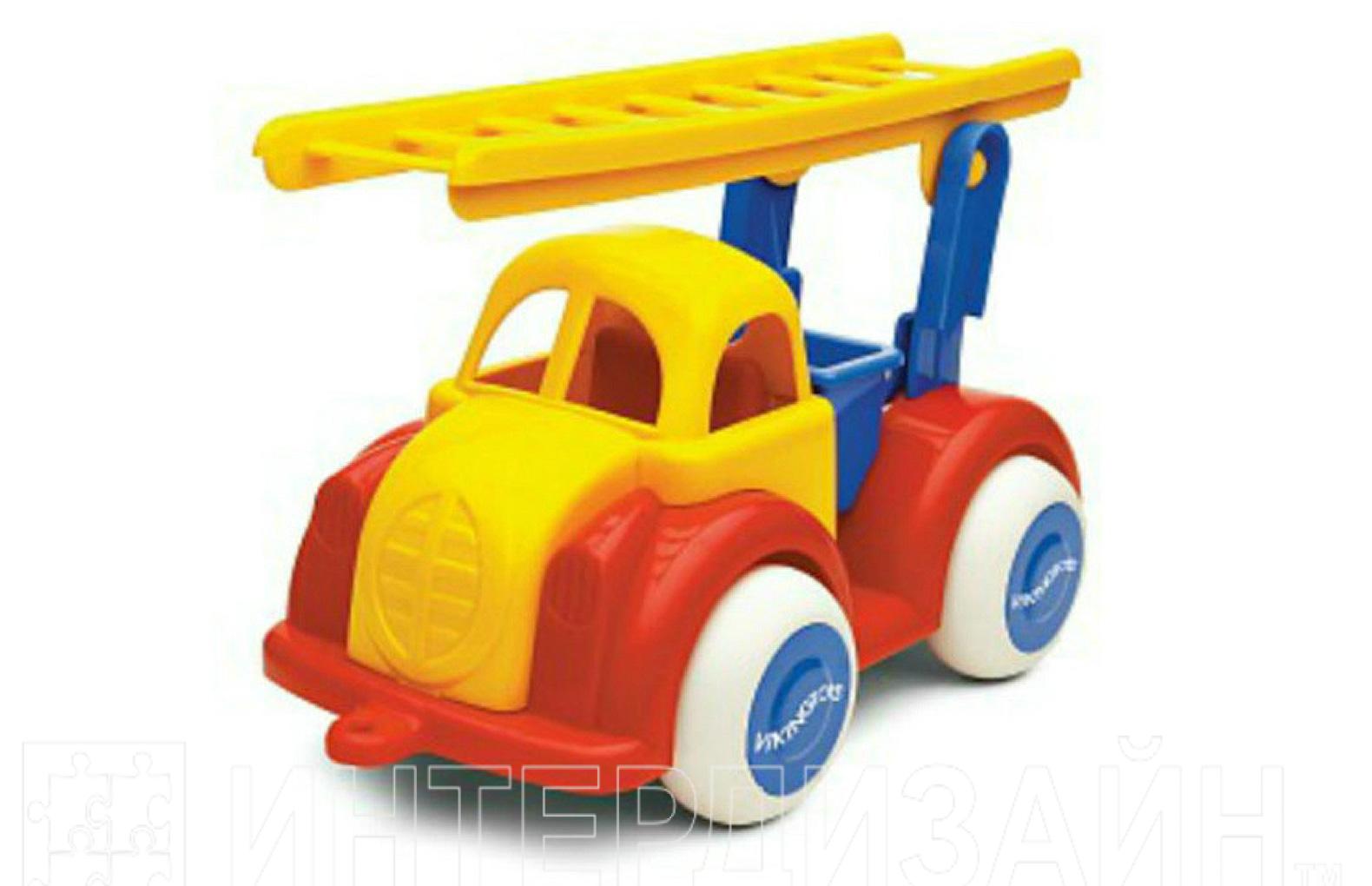 Игрушечная машинка изготовлена из качественного пластика. Кабина машины не имеет стекол, поэтому в нее можно поместить игрушечного водителя. В грузовом отсеке есть раздвижная лестница и бак для песка или воды. У машинки широкие колеса, она может быстро ехать по ровной поверхности.