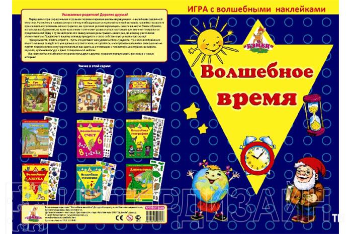 «Волшебное время», игра с наклейками, состоит из веселого игрового поля и наклеек по данной тематике. Наклейки многоразового использования. Их можно отклеивать и наклеивать неоднократно. Даже на посуду, зеркало или кафель и они не портят данной поверхности.