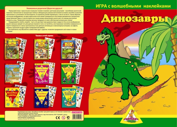 Игра с наклейками "Динозавры"– красочные игровые поля и волшебные наклейки. Многоразовые, хорошего качества. Представляют собой пленку с клейкой основой, легко отделяются от нее, переклеиваются по игровому полю.