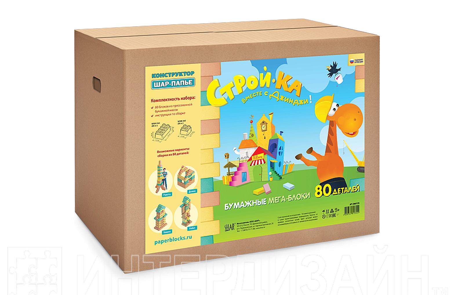 В наборе: 80 блоков из прессованной бумажной массы (60 больших и 20 маленьких) и инструкции по сборке четырех построек (башня, домик, робот и ракета)