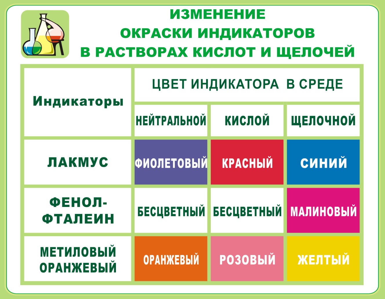 Стенд Изменение окраски индикаторов в различных средах наглядно показывает как должен изменить цвет химический индикатор при реакции на определенную среду. Стенд для школы входит в полный комплект оформления школьного кабинета по химии, можно приобрести отдельно от полного комплекта стендов.