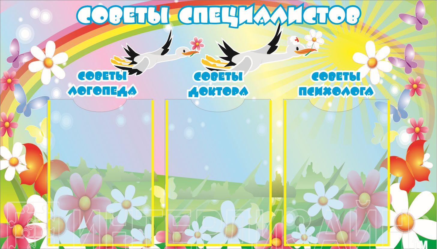 Стенд из пластика, содержит 3 кармана А4: Советы доктора, Советы логопеда, Советы психолога.