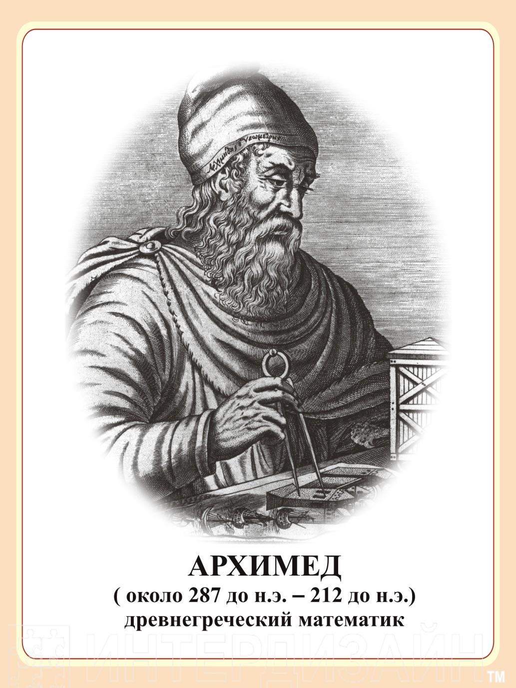 Архиме́д (Ἀρχιμήδης; 287 до н. э. — 212 до н. э.) — древнегреческий математик, физик и инженер из Сиракуз. Сделал множество открытий в геометрии. Заложил основы механики, гидростатики, автор ряда важных изобретений. Стенд портрет входит в полный комплект стендов для оформления школьного кабинета по математике. Можно приобрести отдельно от всего комплекта.