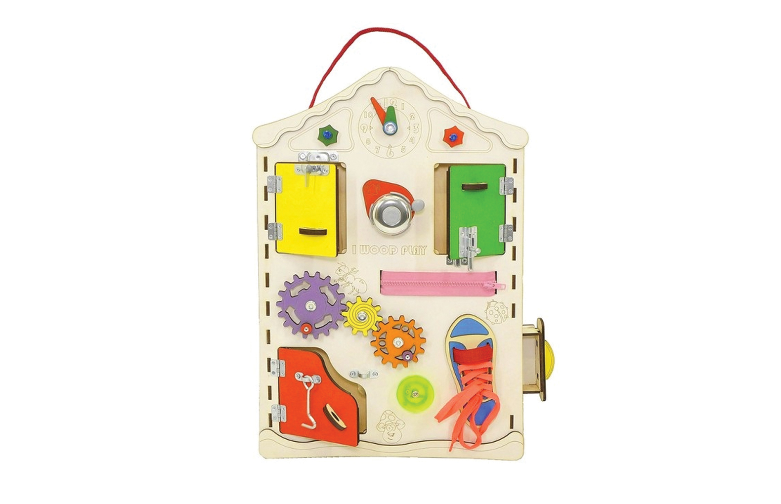 Бизиборд влючает в себя: различные виды тактильных материалов часы с вращающейся стрелочкой панели для развития моторики застежки несколько видов шнуровок фигуркы-вкладыши лабиринт с шариками