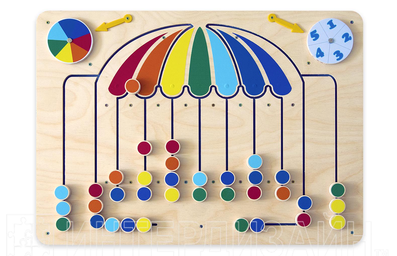 Бизиборд "Веселый зонт" - это отличная игра, развивающая мелкую моторику, счет и логическое мышление. В комплекте есть карточки задания, где ребенок должен повторить заданное расположение цветов. Так же ребенку может помочь с определением рисунка барабаны с цветами и цифрами, где выпадает необходимое количество кружочков определенного цвета, которые нужно разместить в ряд. В игре также есть место для творчества, и ребенок может выстраивать свои рисунки.