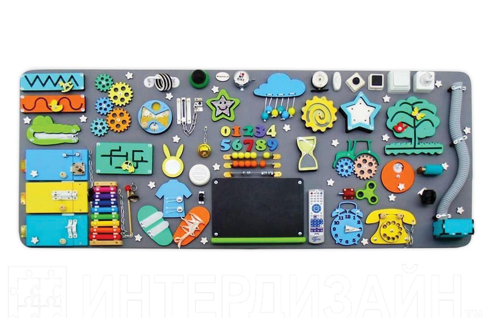 Бизипанель "Активити" обладает большим количеством интересных деталей, которые легко завлекают ребенка к образовательной и безопасной игре.