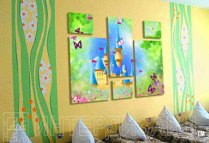 Яркая и красочная модульная картина отлично впишется в интерьер детского сада или детской комнаты. Очень милая и добрая картина, изображающая замок и порхающих бабочек. Состоит из 6 различных по размеру модулей.