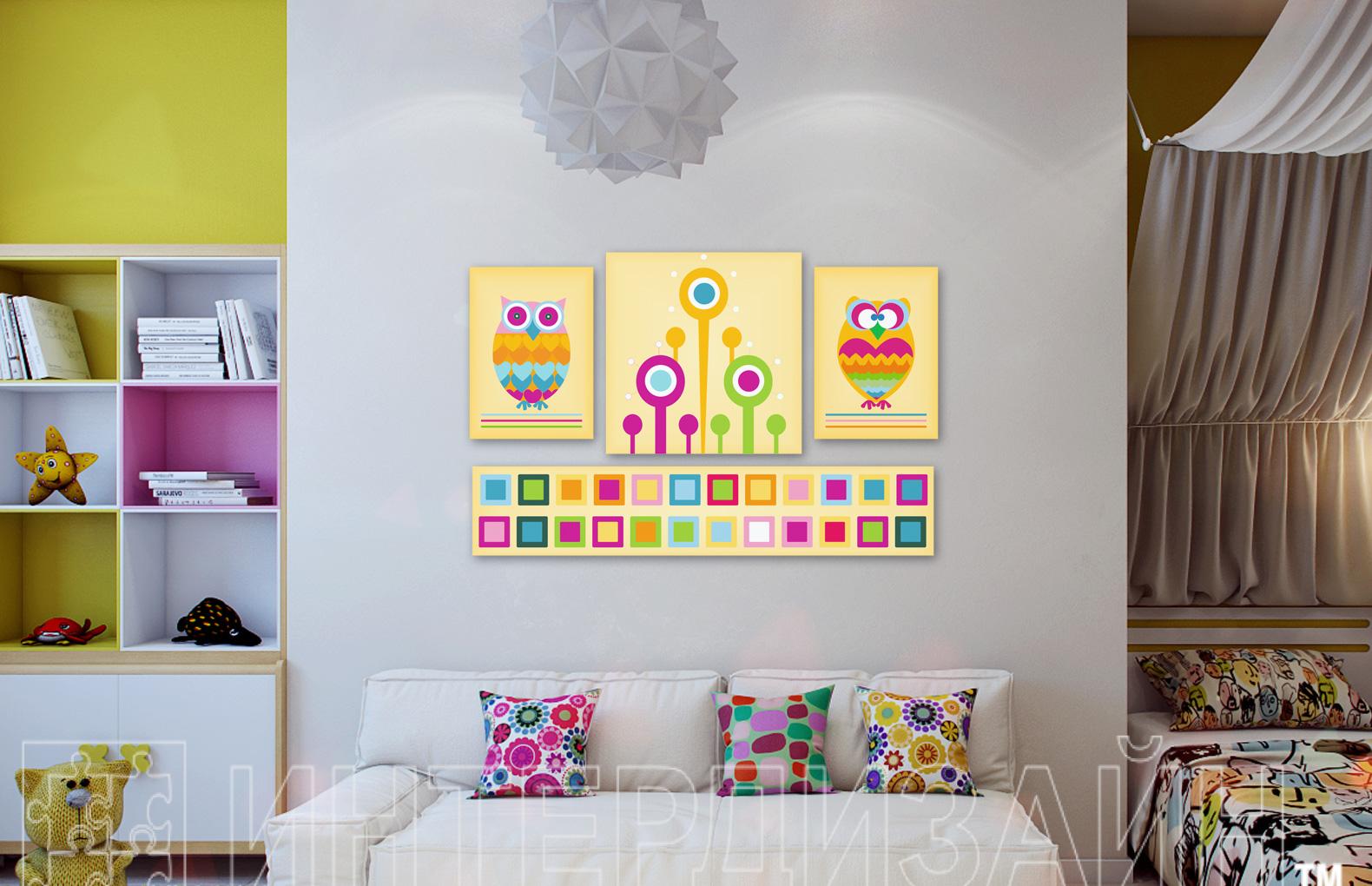 Фантазийные геометрические фигуры замечательно оттеняют смешных совят и задают оптимистичное детское настроение.