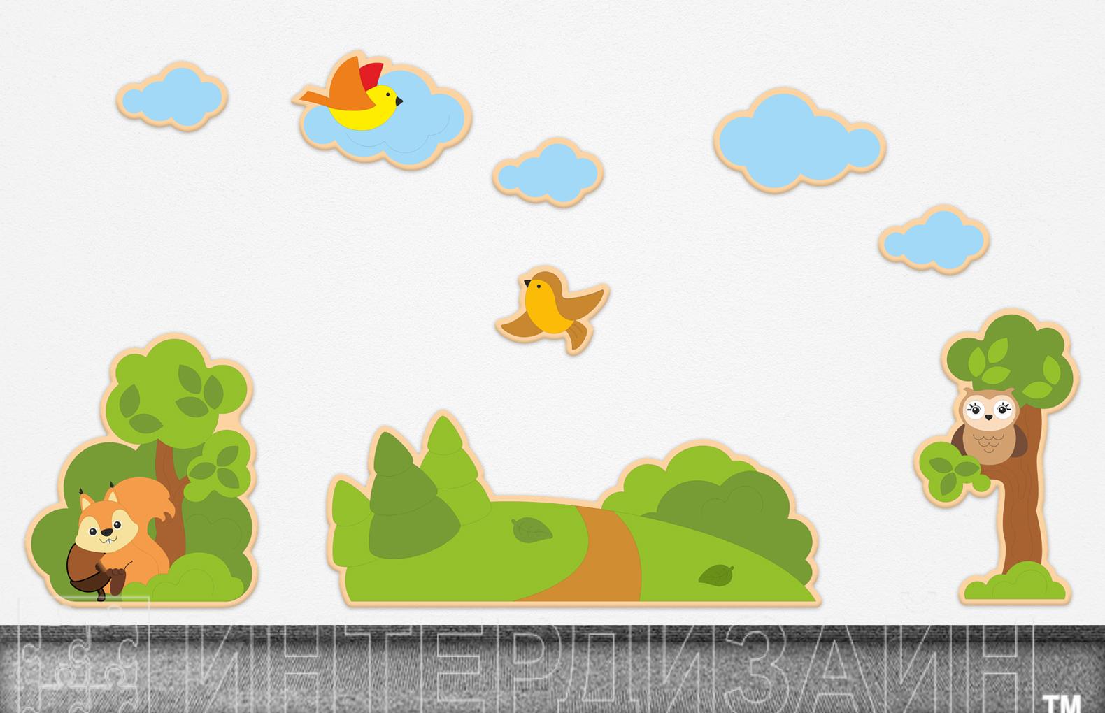 Декорация "Белочка в кустах" 99х118см, Декорация "Лесная дорога" 216х83см, Декорация "Филин на дереве" 68Х127см, Декорация "Тучка" большая 72х42см, Декорация "Тучка" малая 44х26см (3шт.), Декорация "Птичка" 42х38см, Декорация "Птичка в облачке" 74х48см