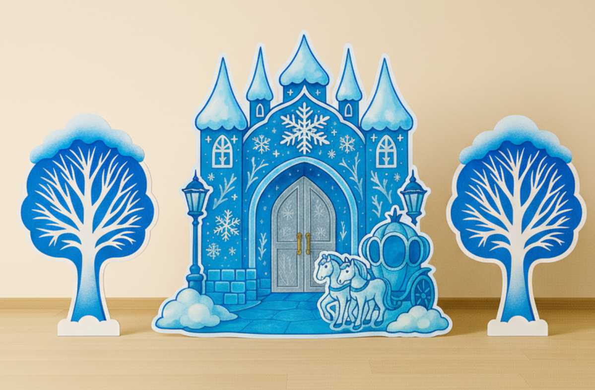 Войдите в мир волшебства с нашим полным набором декораций «Сказка Ледяной принцессы»! Создайте на своей сцене настоящее ледяное царство, где величественный дворец сверкает в окружении таинственного заснеженного леса из двух сказочных деревьев.