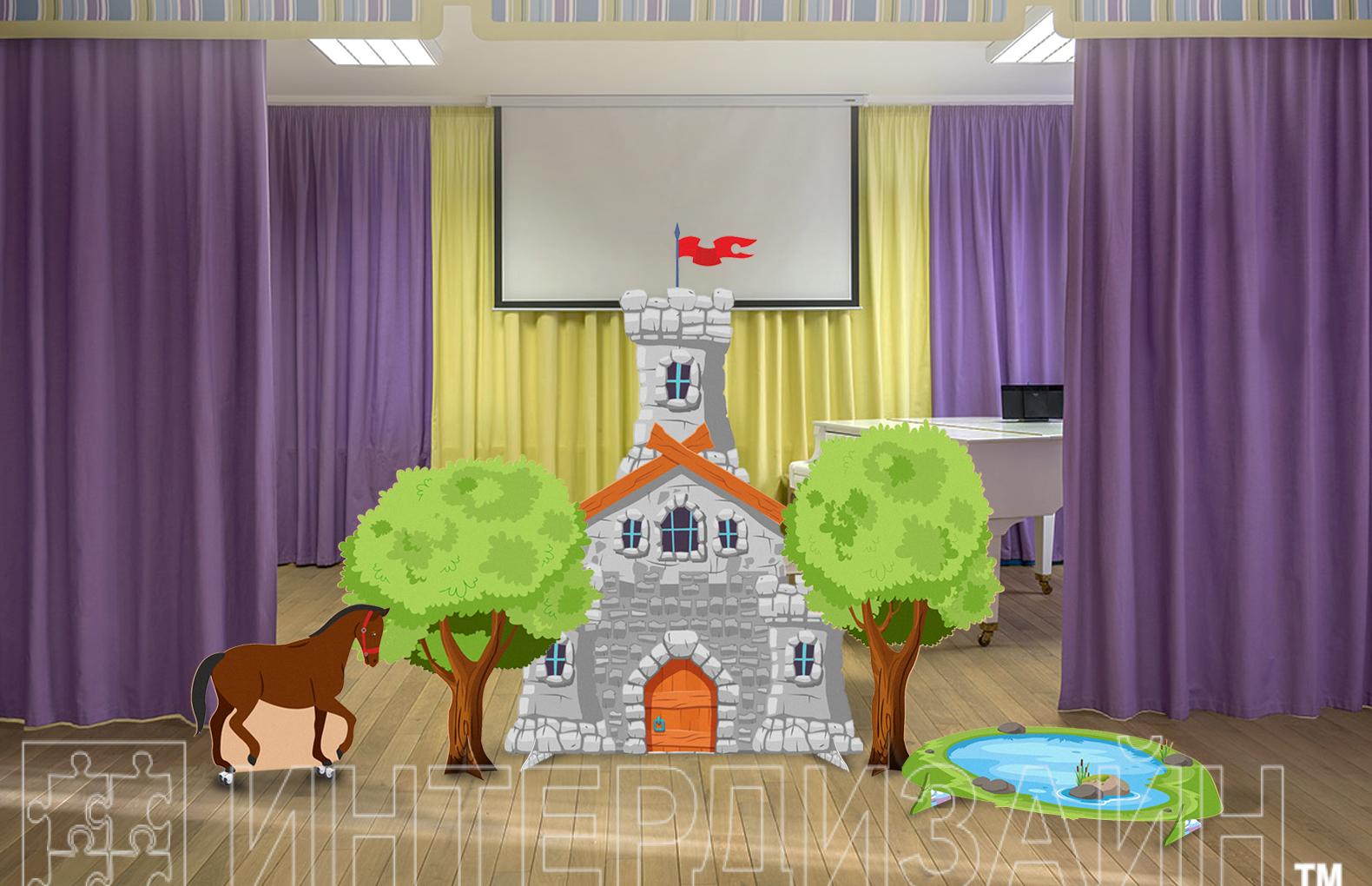 Размеры:декорация "Замок" 115х150 см, двусторонние декорации Деревья 84х98 см и 71х112 см, двусторонняя декорация "Озеро" 115х30 см. декорация "Конь" 64х51 см