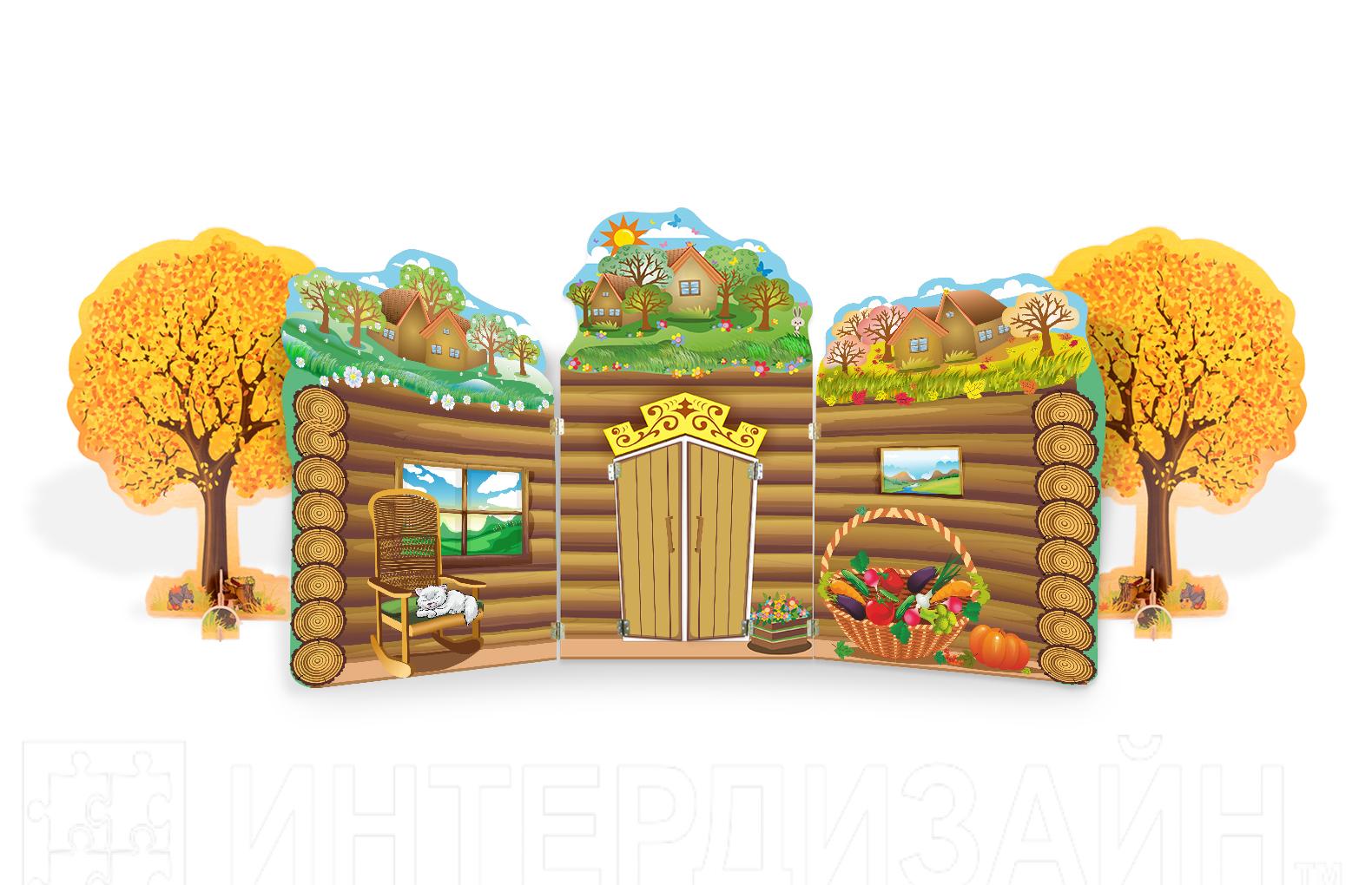 В комплекте:Комплект декораций “В домике Лесовичка” :Дом со сменными магнитными элементами 310х170см ; дерево двустороннее Осень-Зима 90х120см (2 шт). Общий размер 400х170см