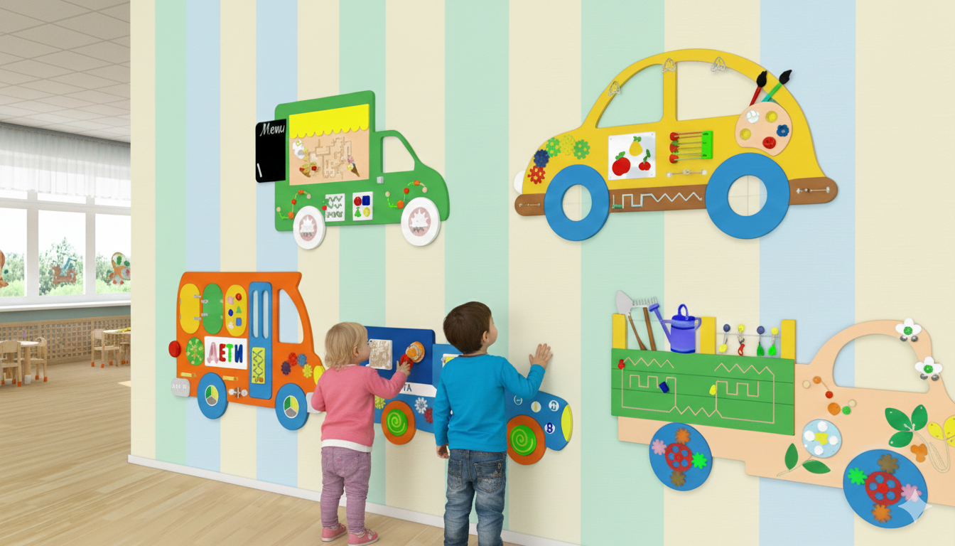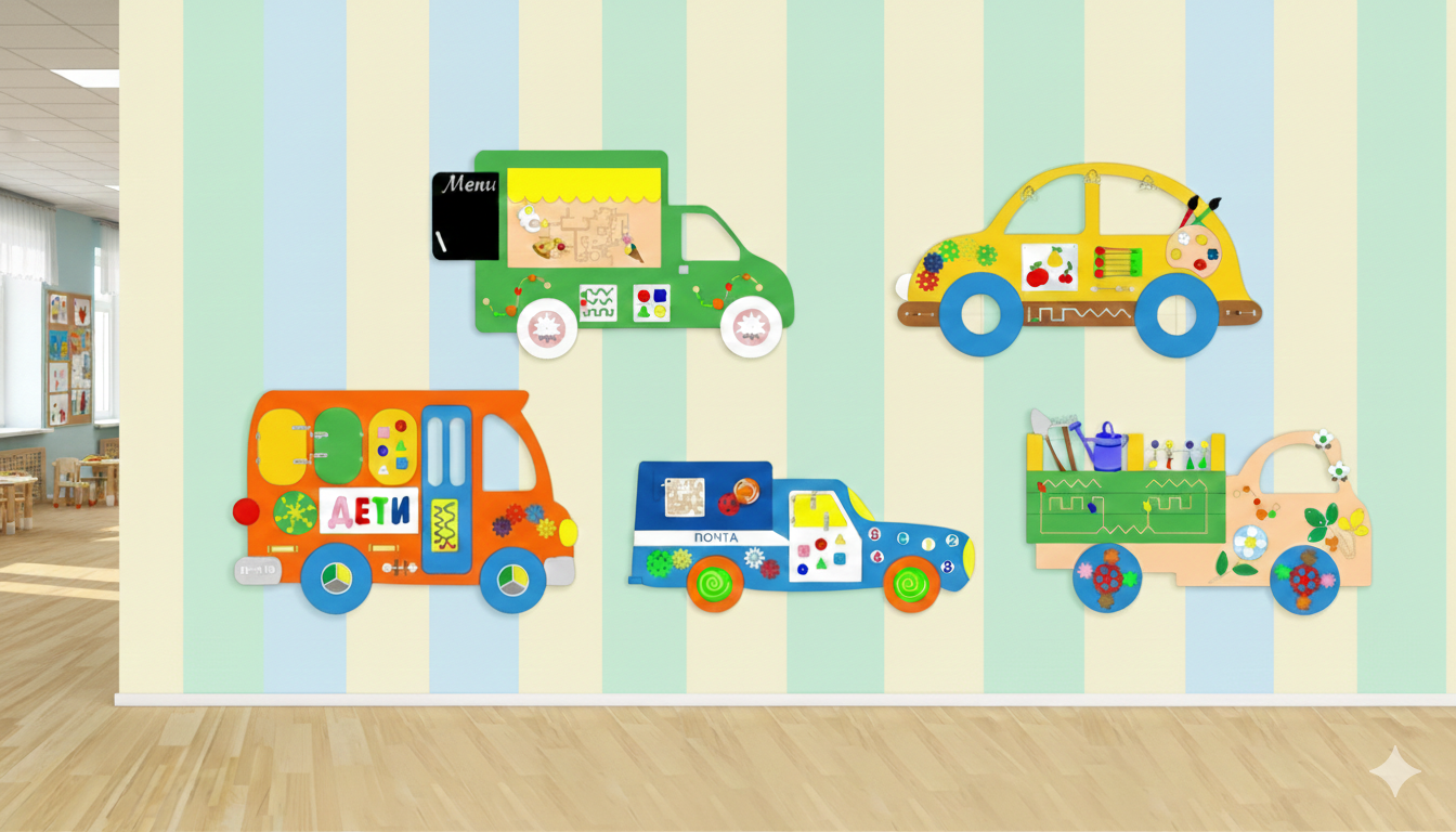 Комплект из пяти интерактивных бизибордов в виде спецтранспорта — это готовое решение для создания развивающей среды. Каждый модуль знакомит ребенка с миром профессий через тактильные ощущения, логические задачи и игровые манипуляции.