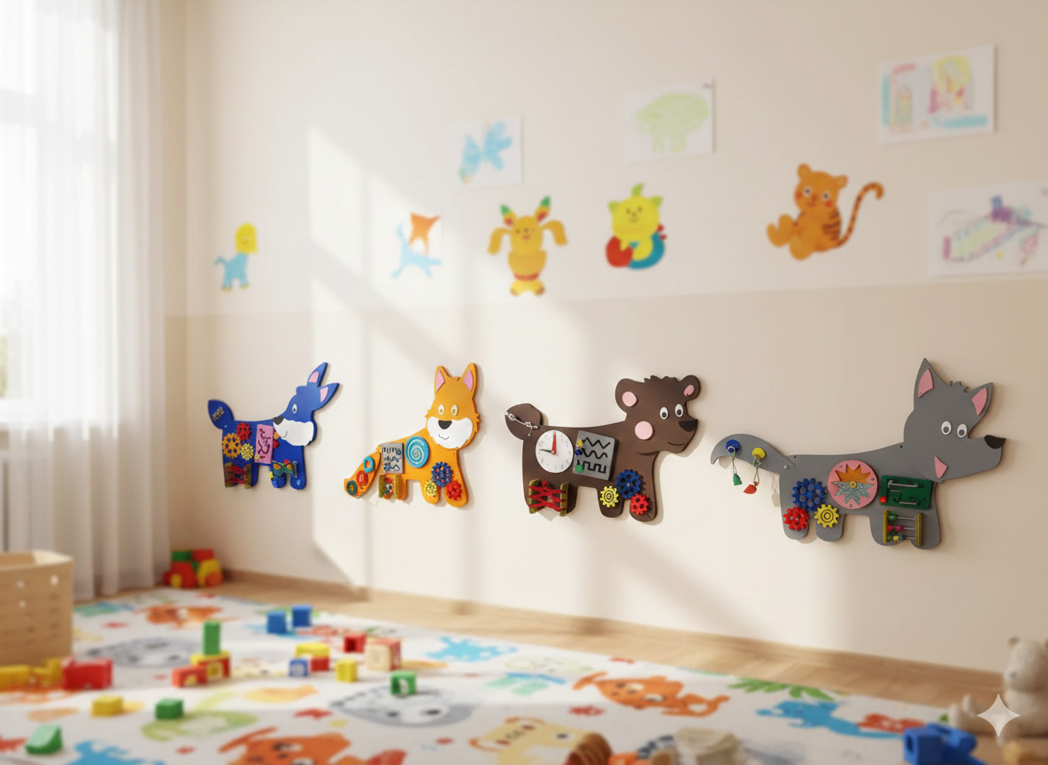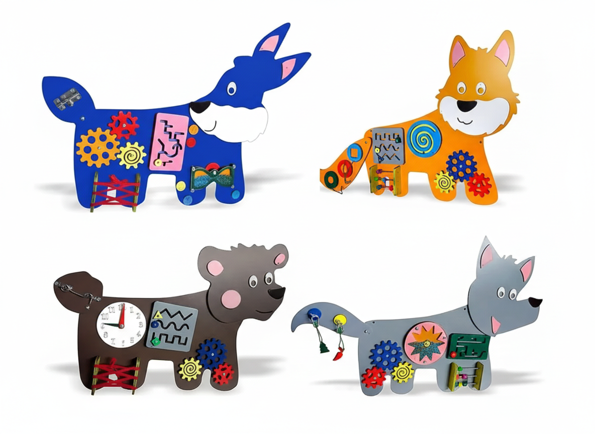 Комплект из четырех масштабных бизибордов предназначен для коррекционной и развивающей работы с детьми от 1 до 7 лет. Каждый персонаж — это не просто украшение интерьера, а полноценный тренажер для развития интеллекта, моторики и психоэмоциональной стабильности.