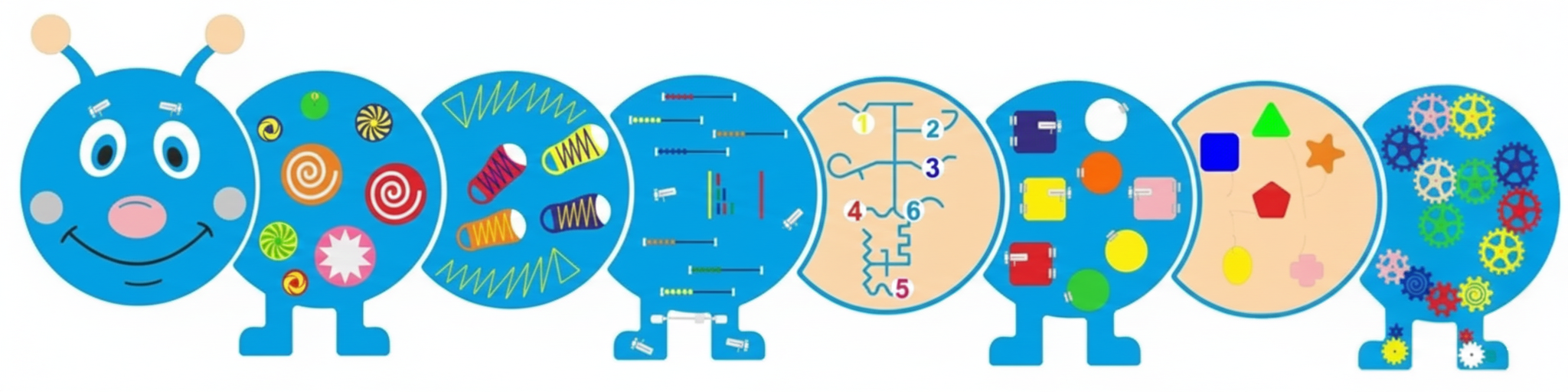 Этот бизиборд — настоящий игровой городок, состоящий из 5–8 круглых модулей (в зависимости от комплектации). Яркий дизайн в виде улыбающейся гусеницы мгновенно располагает детей к игре, а отсутствие острых углов делает занятия абсолютно безопасными.