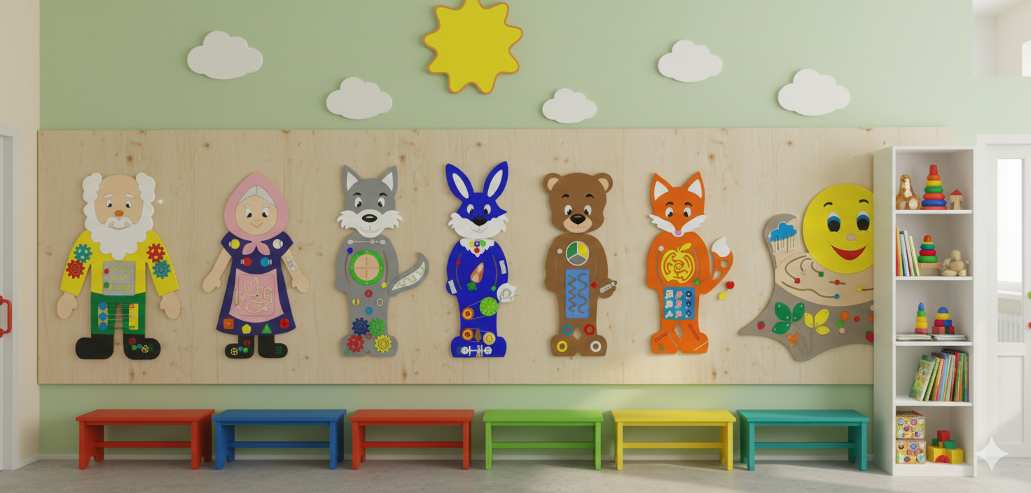 Интерактивный комплекс «Сказка Колобок» — это уникальное сочетание театрализованной деятельности и методики Марии Монтессори. Набор из 7 масштабных панелей оживляет классический сюжет, превращая обучение в захватывающее путешествие по русской сказке.