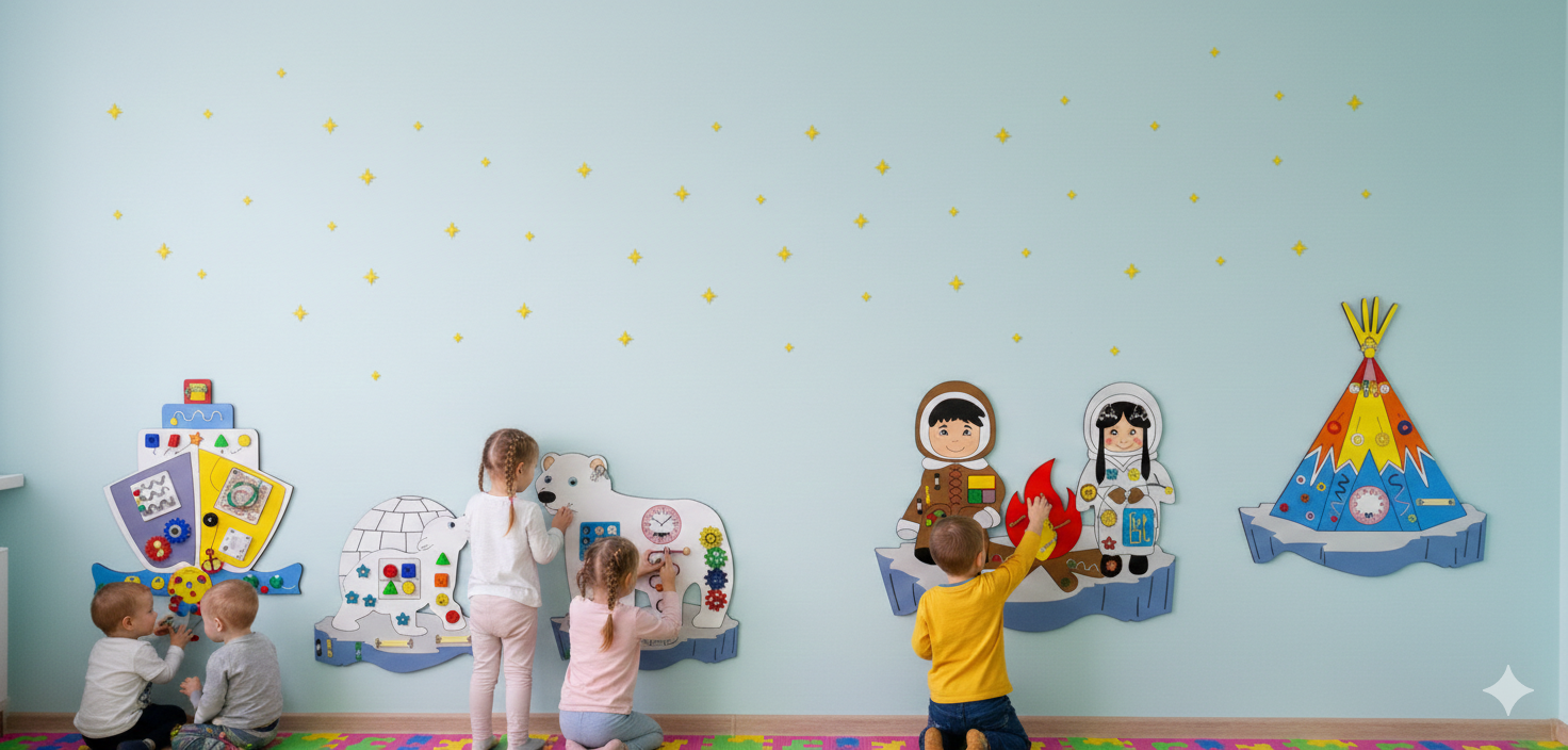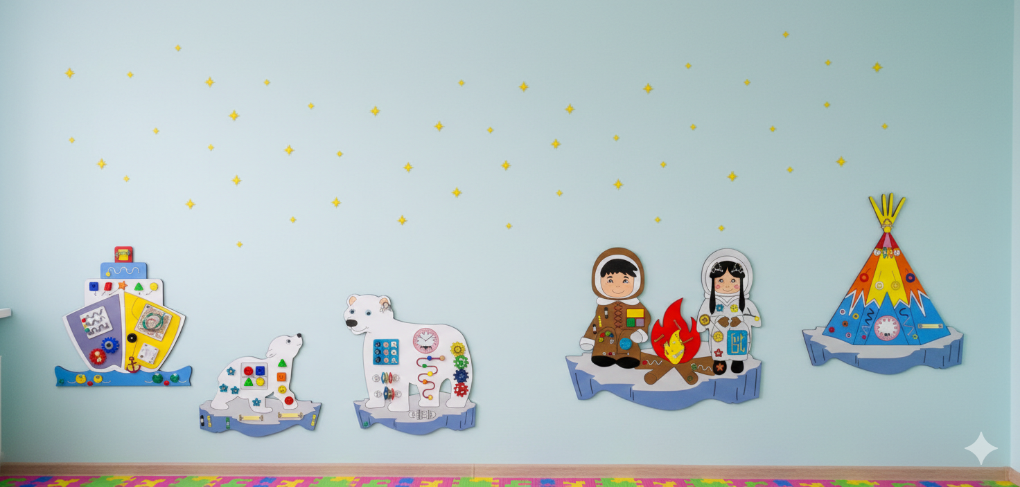 Этот комплект — новое слово в организации развивающей среды. В отличие от монолитных панелей, каждый модуль здесь расположен на индивидуальной основе-льдине. Это дает педагогу полную свободу: «рассыпьте» их по всей стене или создайте компактную игровую зону в углу.