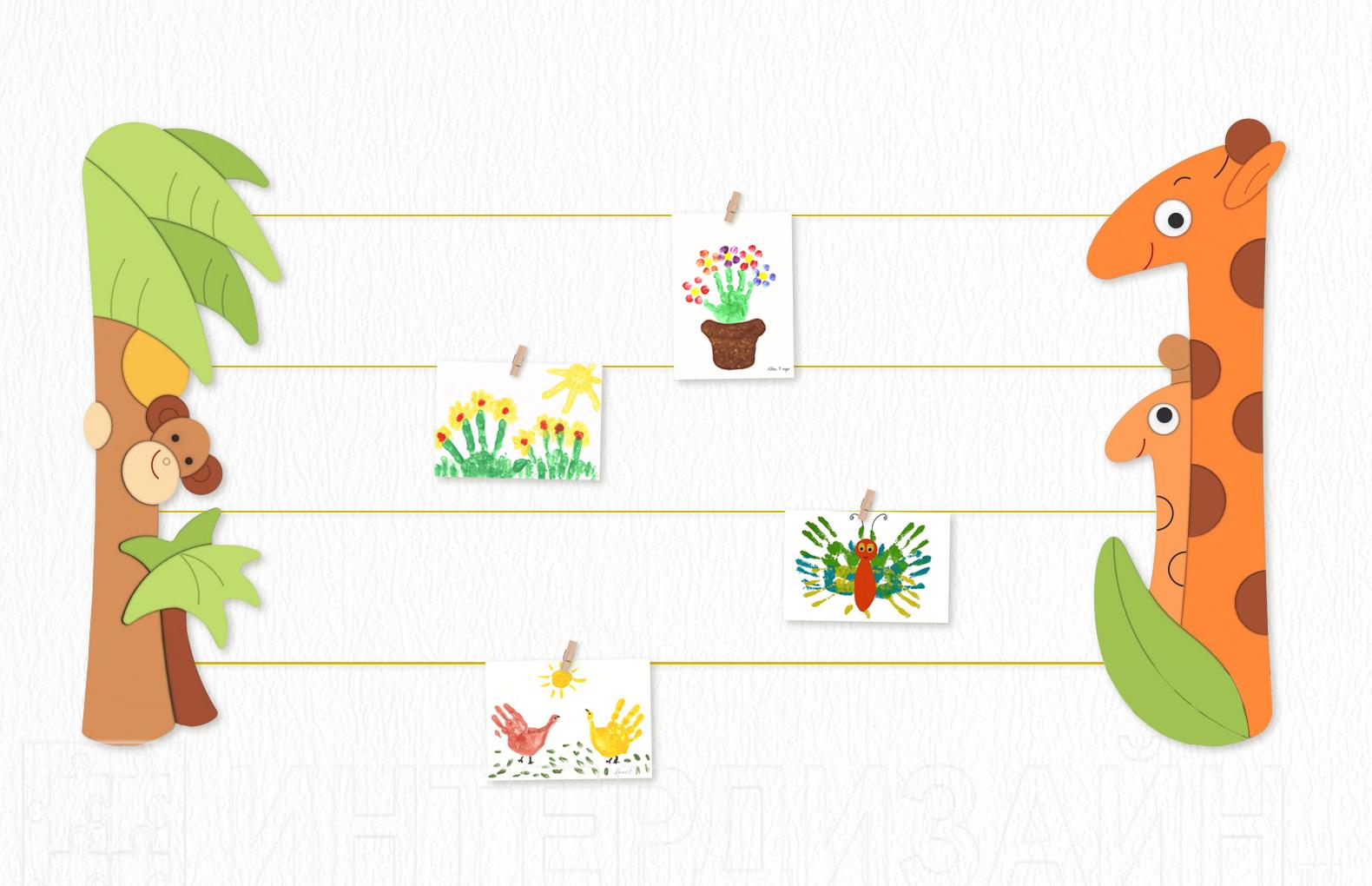 Рисунки и информация крепятся на элементы с помощью декоративных прищепок.