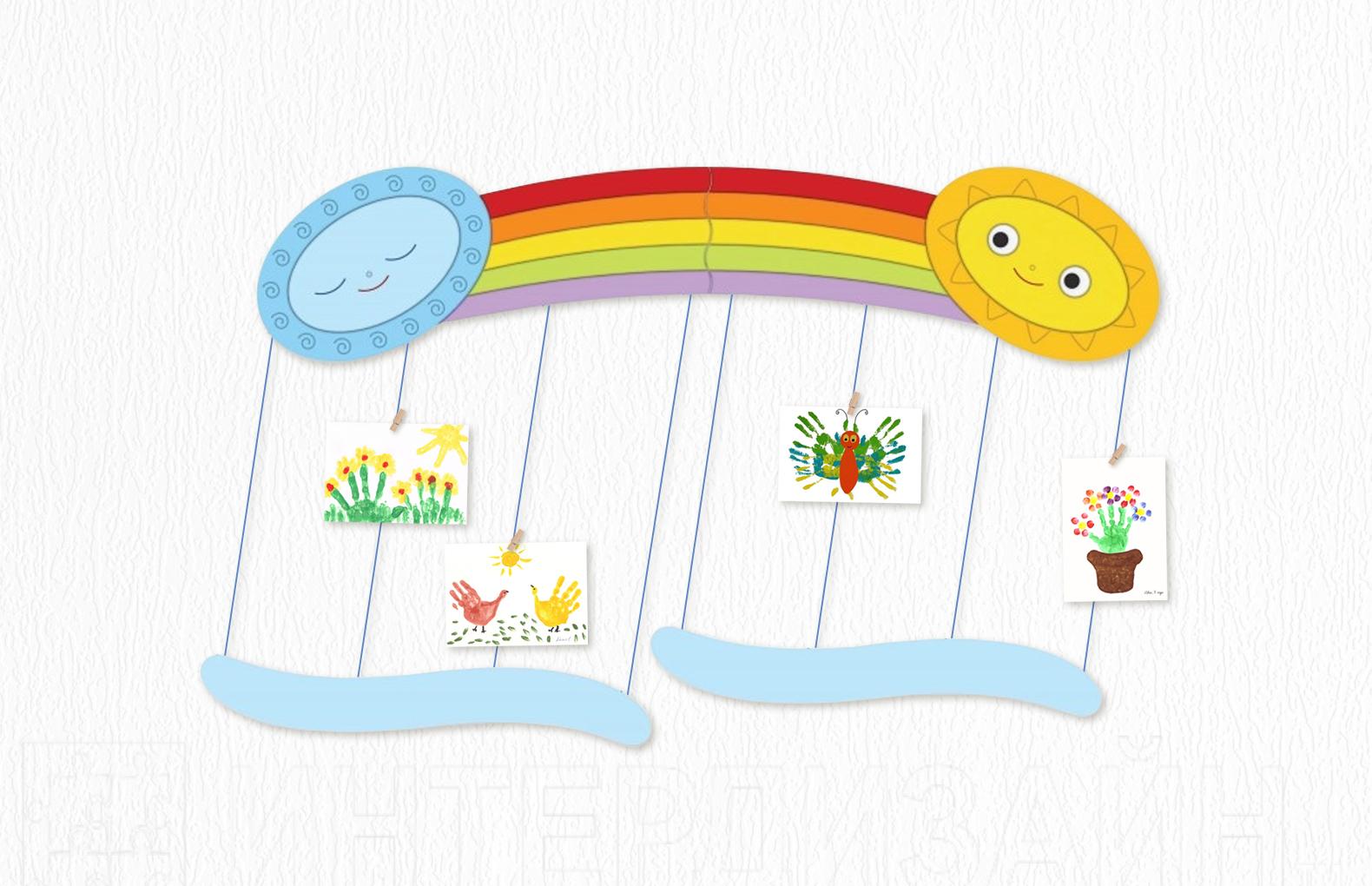 Рисунки и информация крепятся на элементы с помощью декоративных прищепок.