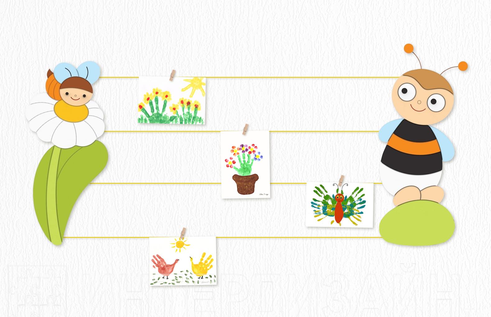 Рисунки и информация крепятся на элементы с помощью декоративных прищепок.