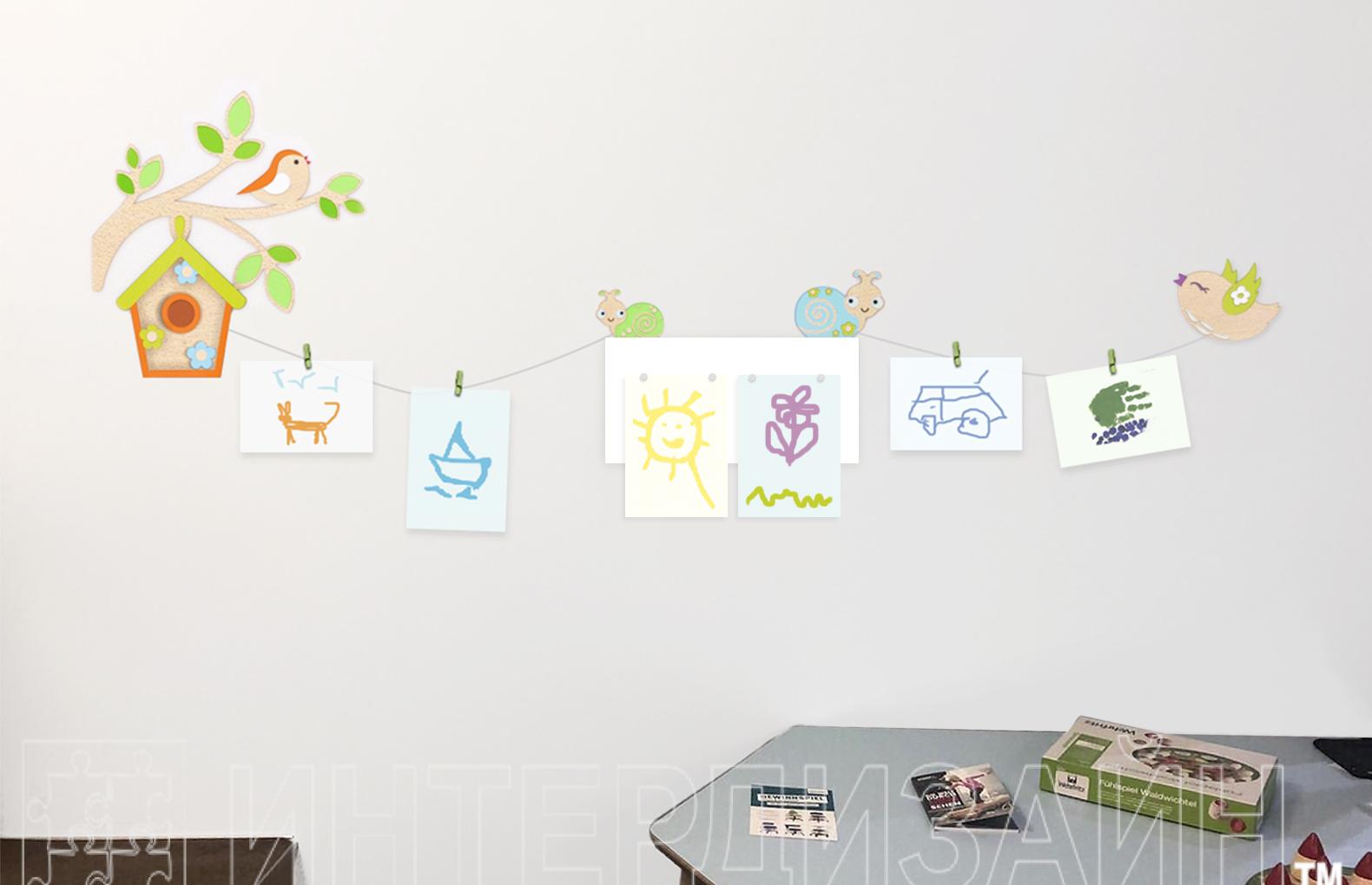 Для размещения рисунков использован трос с декоративными прищепками и высококачественная магнитная панель, к которой при помощи магнитов крепятся рисунки.