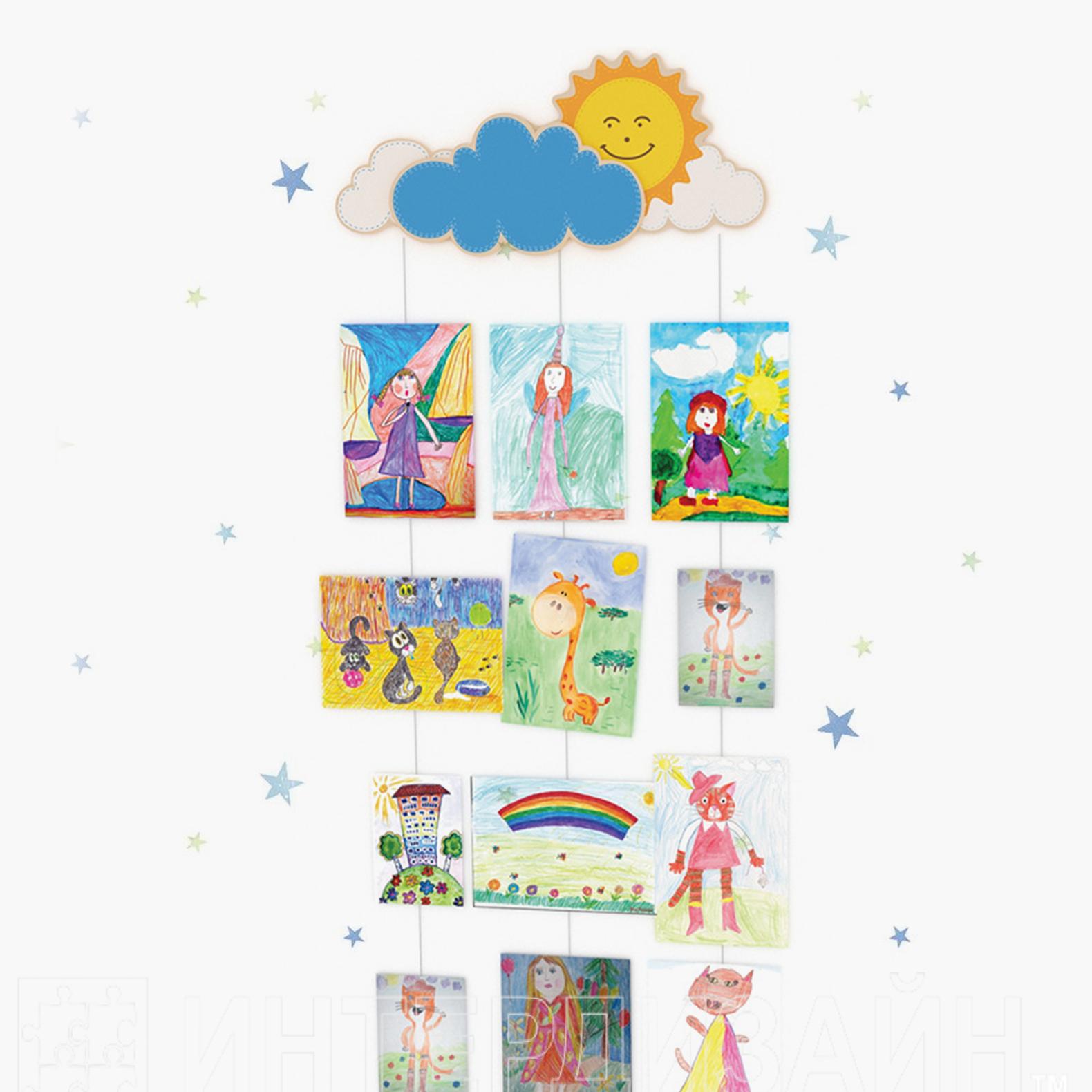 В комплектеСолнце, трос с утяжелителем (3 шт), прищепки для крепления рисунков к тросу (15 шт), фурнитура для крепления к стене