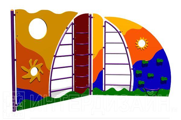 Лаз «Меридиан» представляет собой необычный вариант шведской стенки из нескольких модулей с фигурными металлическими лесенками и декоративными тематическими фанерными панелями.
