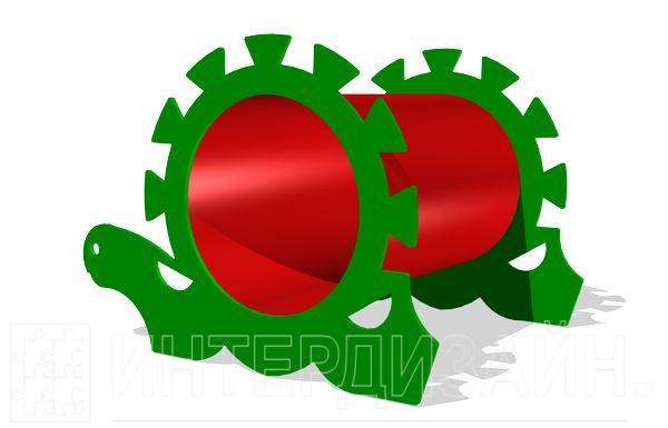 Лаз «Труба «Черепаха» изготовлен из цельнолитой пластмассы и закреплен на опорах металлического каркаса. Входы этого элемента для лазанья оформлены декоративными фанерными накладками.