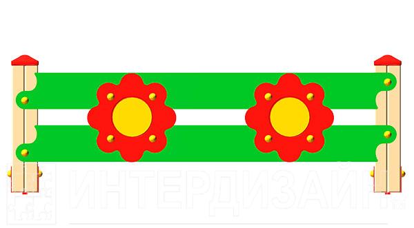 Ограждение для детской площадки «Цветок» представляет собой две горизонтальные направляющие соединенные между собой при помощи двух фигурок изображающих соцветия. Крепеж ограждения осуществляется к столбам из клееного бруса на саморезах, оснащенных пластиковыми заглушками.
