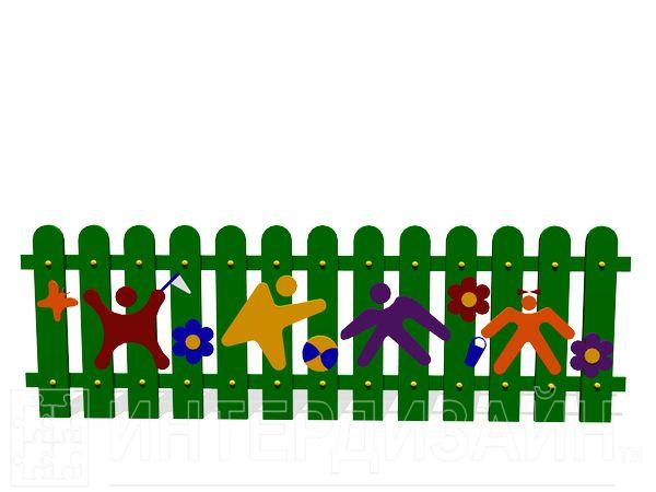 Разноцветные фигурки играющих детей на фоне зеленых штакетин точно соответствуют названию — ограждение детских площадок «Игра».