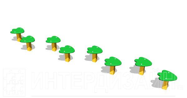 Пеньки «Лягушонок» включают в себя восемь независимо расположенных в две линии элементов. Несущая стойка пеньков оснащена площадкой, на которую ребенок ставит ногу при перемещении. Перемещение осуществляется маленькими шагами, с одной площадки на следующую, расположенную рядом, прямо по ходу движения.