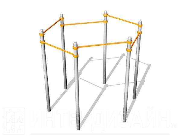 Перекладина шестерная ВА-2200-2400 с турниками установленными на высоте 2200 и 2400 мм для занятий воркаутом на уличных спортивных площадок. Стойки этого спортивного располагаются по углам правильного шестиугольника и соединяются перекладинами при помощи стальных разъемных хомутов.