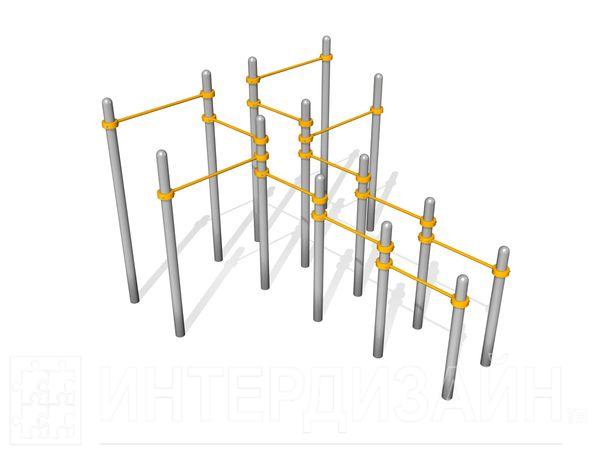 Комплекс представляет собой конструкцию четырнадцати разновысоких стоек, установленных лестницей и связанных перекладинами с помощью специальных хомутов-зажимов.