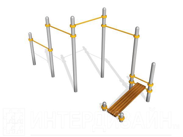 В состав воркаут-комплекса ВА019 входит группа разновысоких турников и скамья для пресса. Комплекс состоит из массивных стоек объединенных этими спортивными снарядами в одну конструкцию.