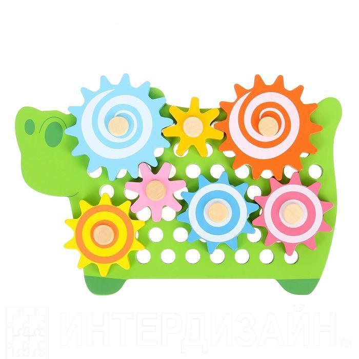 Замечательный зеленый бегемотик и 7 шестеренок разного размера. Набор выполнен из дерева. Окрашен в яркие и приятные цвета. Суть игры состоит в креплении шестеренок на бегемотика таким образом, что бы при поворачивании одной шестеренки крутились все остальные. Для начала можно собрать цепочку из двух или трех деталей, постепенно усложняя конструкцию до шести элементов.