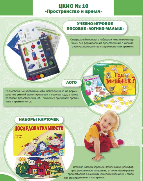 Игровые наборы карточек, позволяющие формировать представления о единицах измерения времени (час, сутки, неделя, месяц, год) и способах его определения и измерения (часы с разными циферблатами, календарь). Кроме того, с их помощью можно обучить детей ориентироваться во времени, соотносить свою деятельность с его течением, выполнять распорядок дня. .