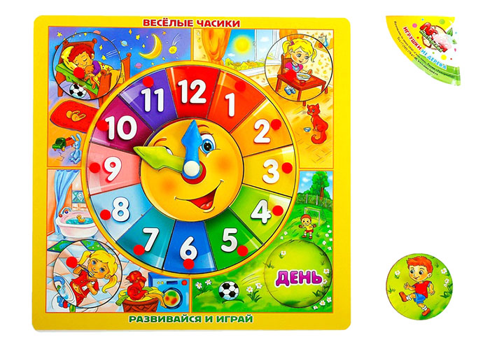 Яркая и красочная развивающая игрушка состоит из деревянной рамки-основы и 16 цветных элементов с удобными ручками. Благодаря игрушке ребенок разовьет мышление, наблюдательность и внимательность, научится правильно определять время по часам.