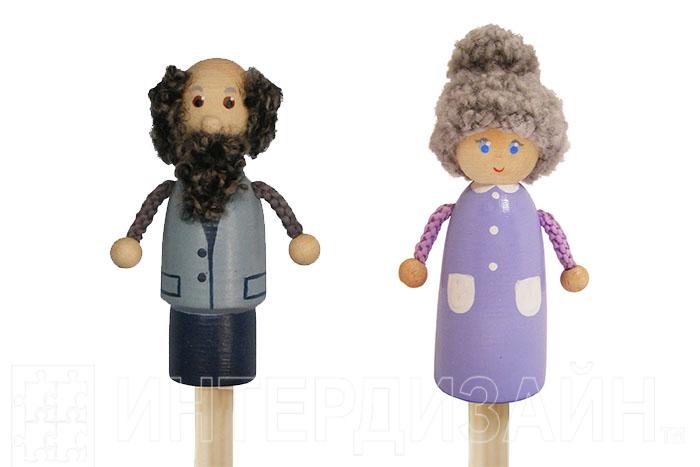 Предлагаем вашему вниманию пальчиковые куклы с двумя персонажами — бабушки и дедушки. Они могут использоваться для проигрывания сцен самостоятельно или в комплекте с остальными фигурами. Игрушки, изготовленные из дерева, имеют мягкие, приятные на ощупь волосы и выглядят очень реалистично.