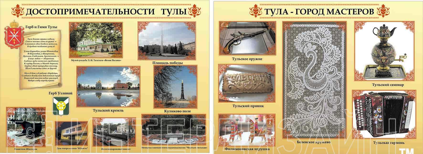 Комплект стендов "Тула" – набор из 2 качественных красочных стендов размером 1500*1000 мм. Стенды отличает повышенная износоустойчивость, достигаемая за счет технологии нанесения изображения, которое защищено от выгорания. Стенды изготовлены из прочного пвх толщиной 3мм.