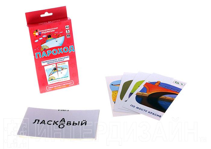 Развивающие и обучающие карточки "Пароход" научат Вашего ребенка писать грамотно, видеть орфограммы, а также способствуют запоминанию правил русского языка. Набор состоит из 48 карточек, которые научат без ошибок писать окончания имён прилагательных.