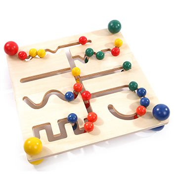 В платформе проделаны сквозные бороздки по которым двигаются 20 фишек — шариков (4 желтых. 4 синих, 4 зеленых и 8 красных). По углам находятся «домики» в которые необходимо передвинуть шарики того цвета, который указывает большой шар-подставка. Бороздки выполнены в форме изогнутых и прямых линий, что усложняет задачу делая ее интереснее.