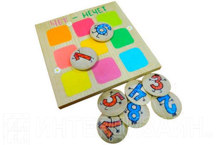 В набор входит игровое поле, 8 фишек с весёлыми рисунками цифр от 1 до 8. Все детали деревянные, из них чётные числа представлены синим цветом, а нечётные цифры – красным. Яркое игровое поле – является основой, размером 150*150 мм для проведения мини-турниров, на котором изображены девять разноцветных клеток под фишки. Варианты игры «Чет-нечет» разные и всё зависит от возрастной категории участников и количества детей.