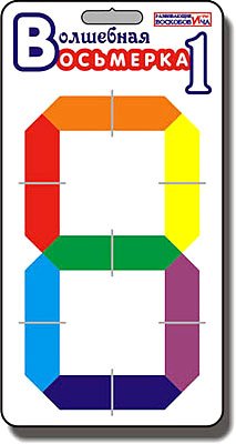 Волшебная восьмерка состоит из 7 разноцветных деревянных элементов (соответствующих 7 цветам радуги), которые при помощи резинок закреплены на фанерной основе. Под каждой фигуркой нанесен буквенный шифр- считалочка (первая буква каждого слова считалочки соответствует названию цвета). Поняв закономерность, ребенок без труда сможет выполнить задания, составляя цифры не только по словесной модели, но и по собственному замыслу.