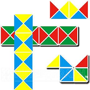 Змейка представляет собой полоску ткани, на которую наклеены треугольники разных цветов: одна сторона змейки состоит из желтых и синих треугольников, вторая – из красных и зеленых.