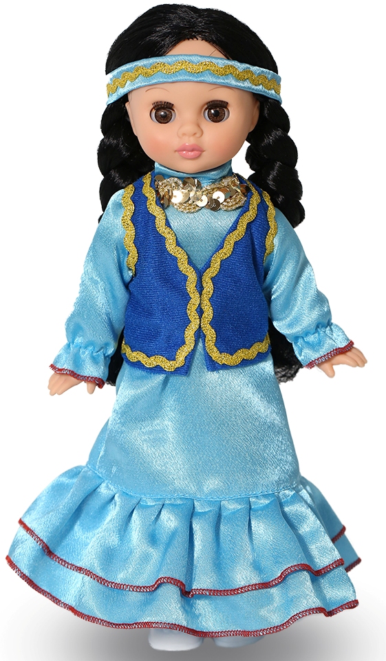 Эта кукла из серии «Этно» может стать настоящей подружкой для ребёнка. Эта кукла одета в стилизованный башкирский национальный костюм. В комплект одежды куклы входит: платье, жилет, ободк, туфли. Платье длинное, с расклешением книзу, с длинными рукавами, воротником-стойкой, застёжкой сзади на липкую ленту. По низу платья оборки. Эмитация украшей выполнена из кружевной тесьмы. Жилет из ворсового трикотажа таже отстрочен тесьмой. Ободок из шелка с застёжкой сзади. Комплект дополняют туфли. Производитель оставляет за собой право изменения цветовой гаммы одежды и волос куклы, цвет глаз может варьироваться. Игровые и дидактические возможности куклы: Эля Весна в норвежском костюме может быть так называемой «методической куклой» для обучения детей культурным и национальным особенностям разных народов. Наличие элементов одежды, которые легко снимаются и надеваются, разнообразит возможности сюжетно-ролевых игр с этой куклой, в процессе которых развивается мелкая моторика и творческое воображение ребёнка.