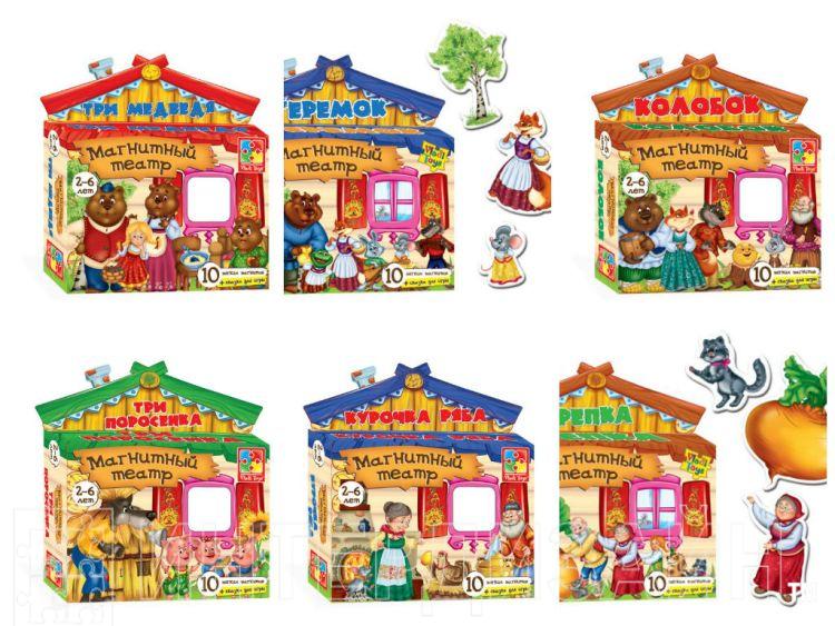 В комплект входят 6 магнитных театров по мотивам народных сказок: