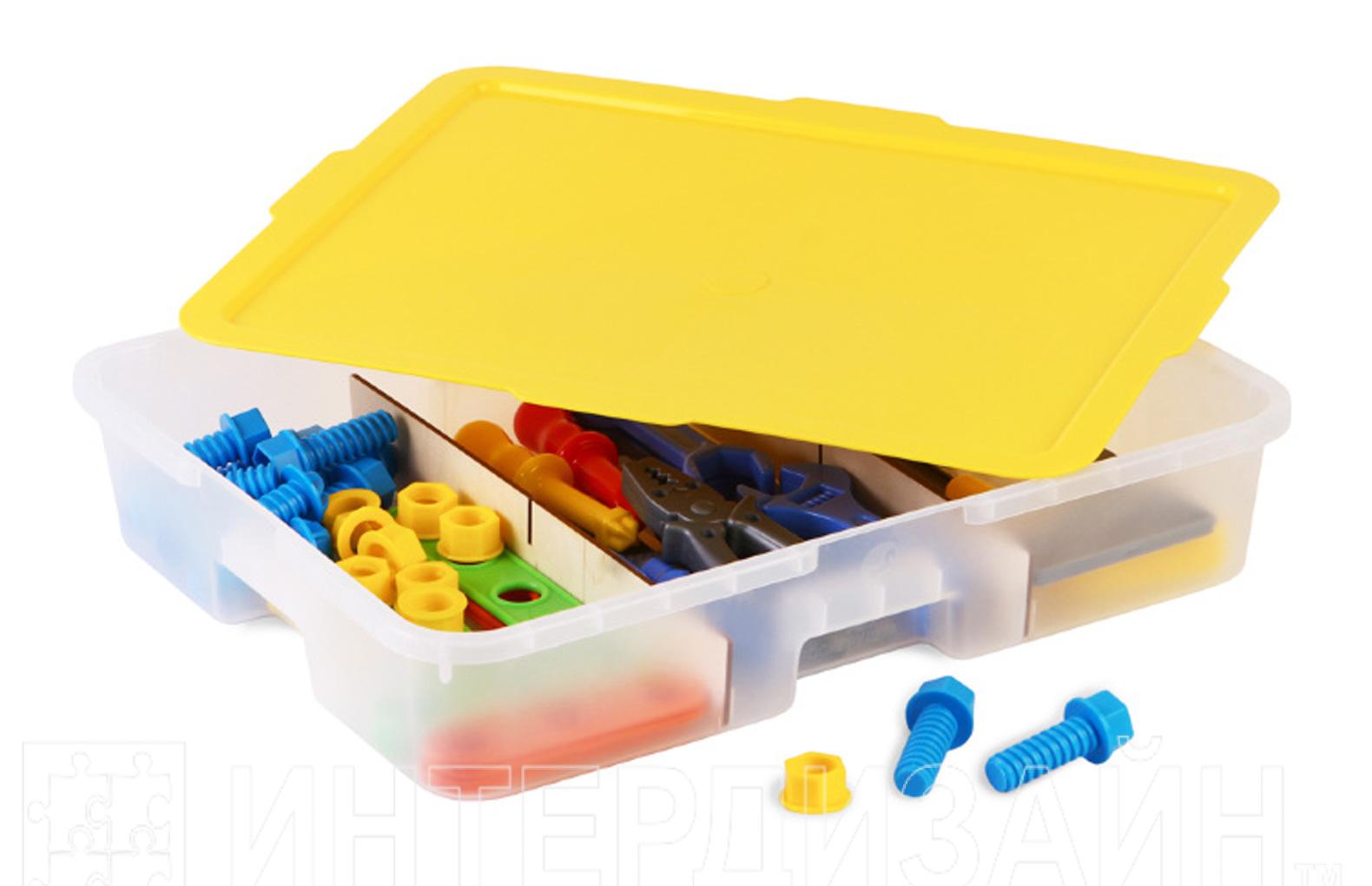 В комплекте:49 деталей для слесарных работ: гайки, болты, отвертки, гаечные ключи, ножовка, топор, молоток, плоскогубцы, разводные ключи, контейнер Игротека №1.